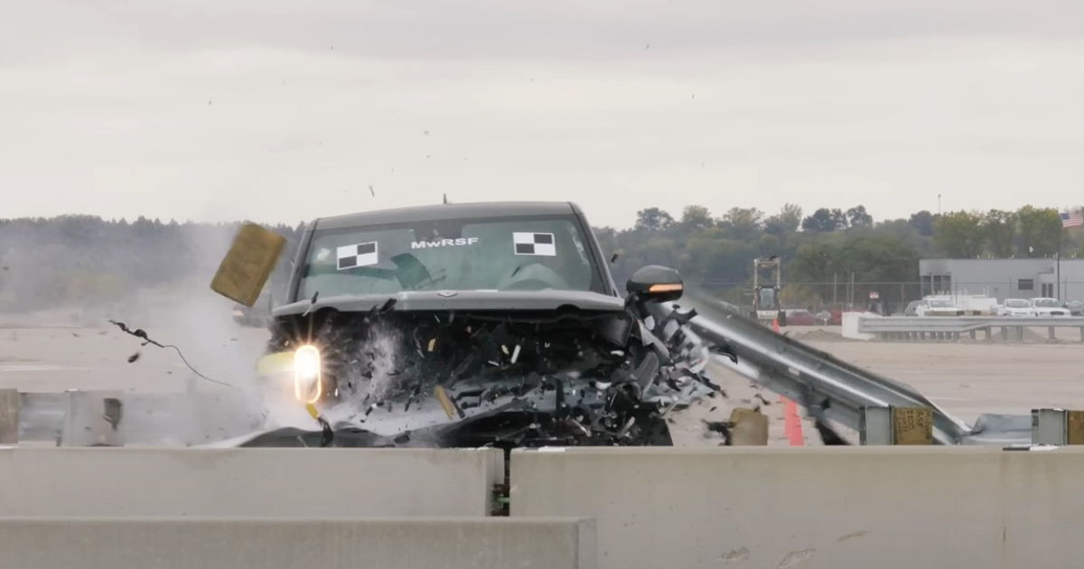 最近美國內布拉斯加大學林肯分校做了一個實驗,用一輛Rivian R1T電動皮卡60mph〈約96km/h〉的車速正面撞擊標準護欄,試試看護欄是否能攔住Rivian R1T。結果Rivian R1T不僅直接將護欄撞斷,還翻越了後方第二層防護用的混泥土護欄,若是車速再加快,Rivian R1T是有可能直接飛越護欄。