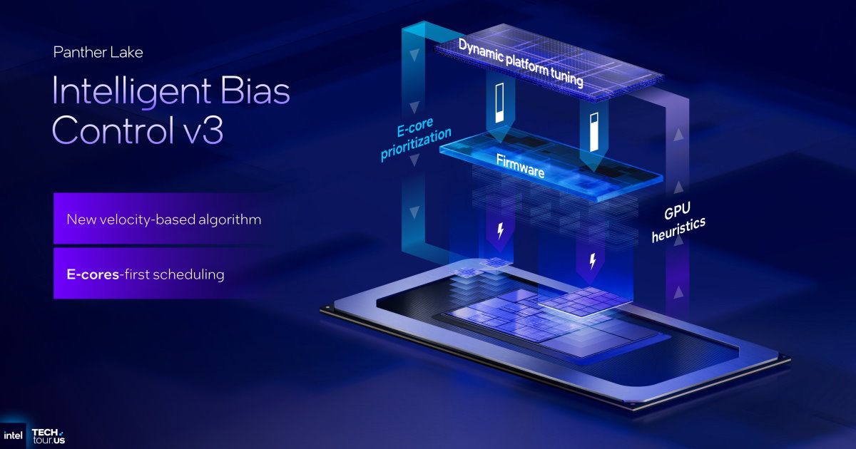 Intel針對Panther Lake設計了第3代智慧型偏差控制(Intelligent Bias Control v3)電源管理功能,會優先將處理器負載放置於E-Core,並透過韌體判斷遊戲對於處理器或內建顯示晶片的需求較高,進而動態調整電力供應的比重以及彼此的時脈。