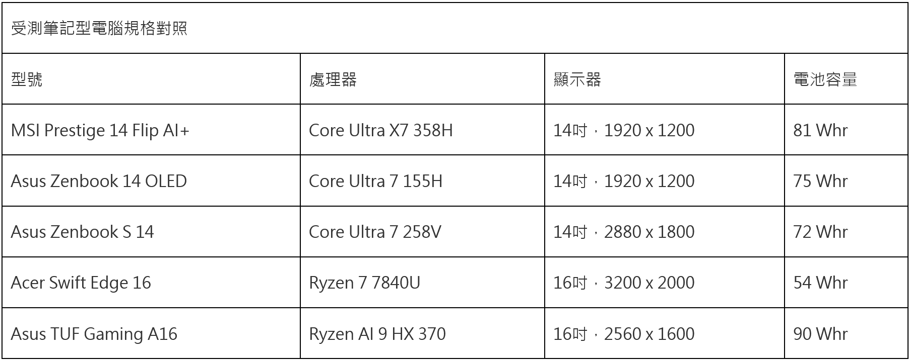 這次的對照組為搭載代號為搭載AMD Ryzen AI 9 HX 370處理器的Asus TUF Gaming A16,以及Ryzen 7 7840U處理器的Acer Swift Edge 16(SFE16 -43-R7AC)與Intel Core Ultra 7 258V處理器的Asus Zenbook S 14(UX5406),,第1款數據取自《AMD Ryzen 9 AI 9 HX 370效能實測》專題,後2款取自《Intel Lunar Lake效能實測》專題。