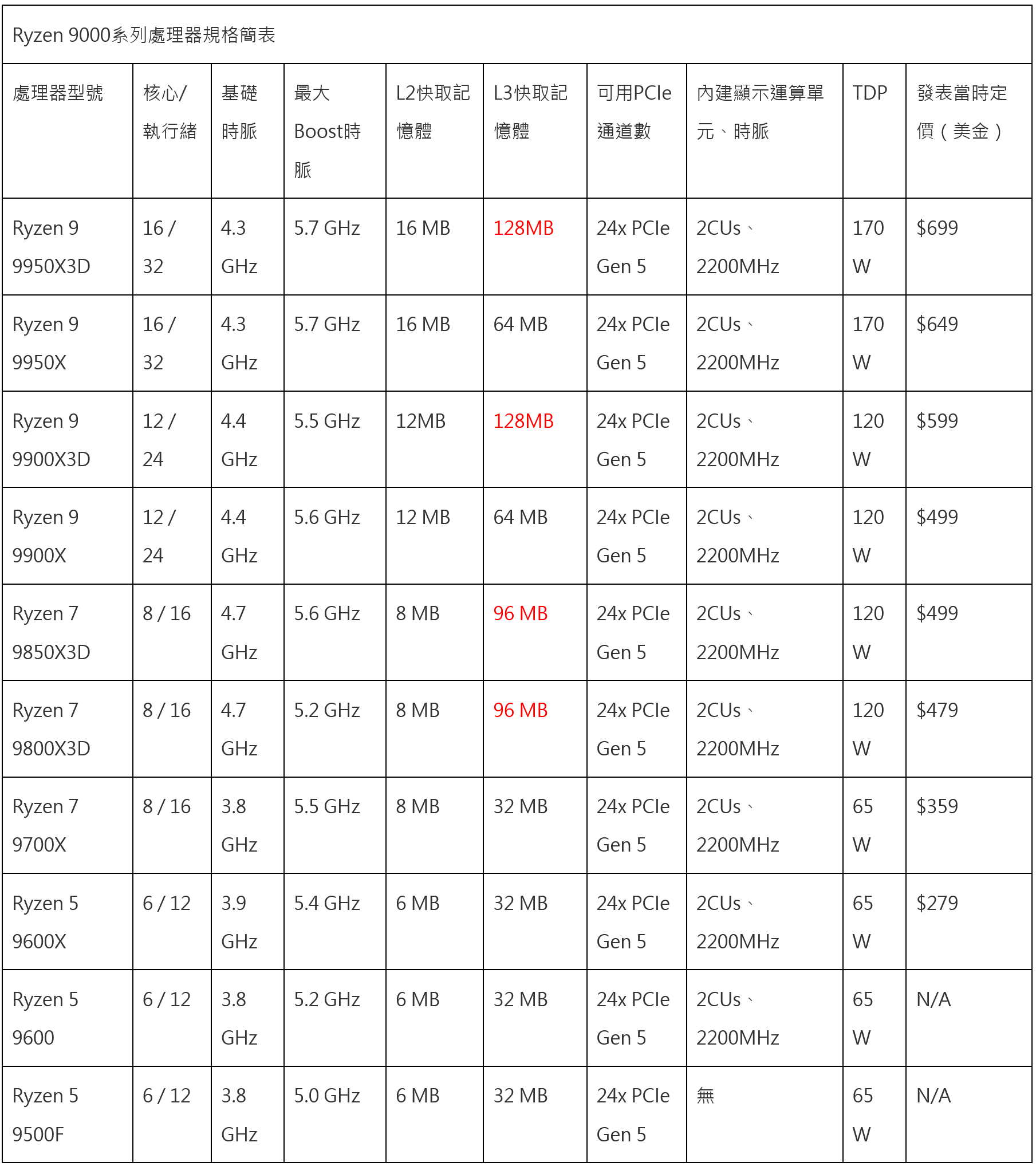 | Ryzen 9000系列處理器規格簡表 | |||||||||