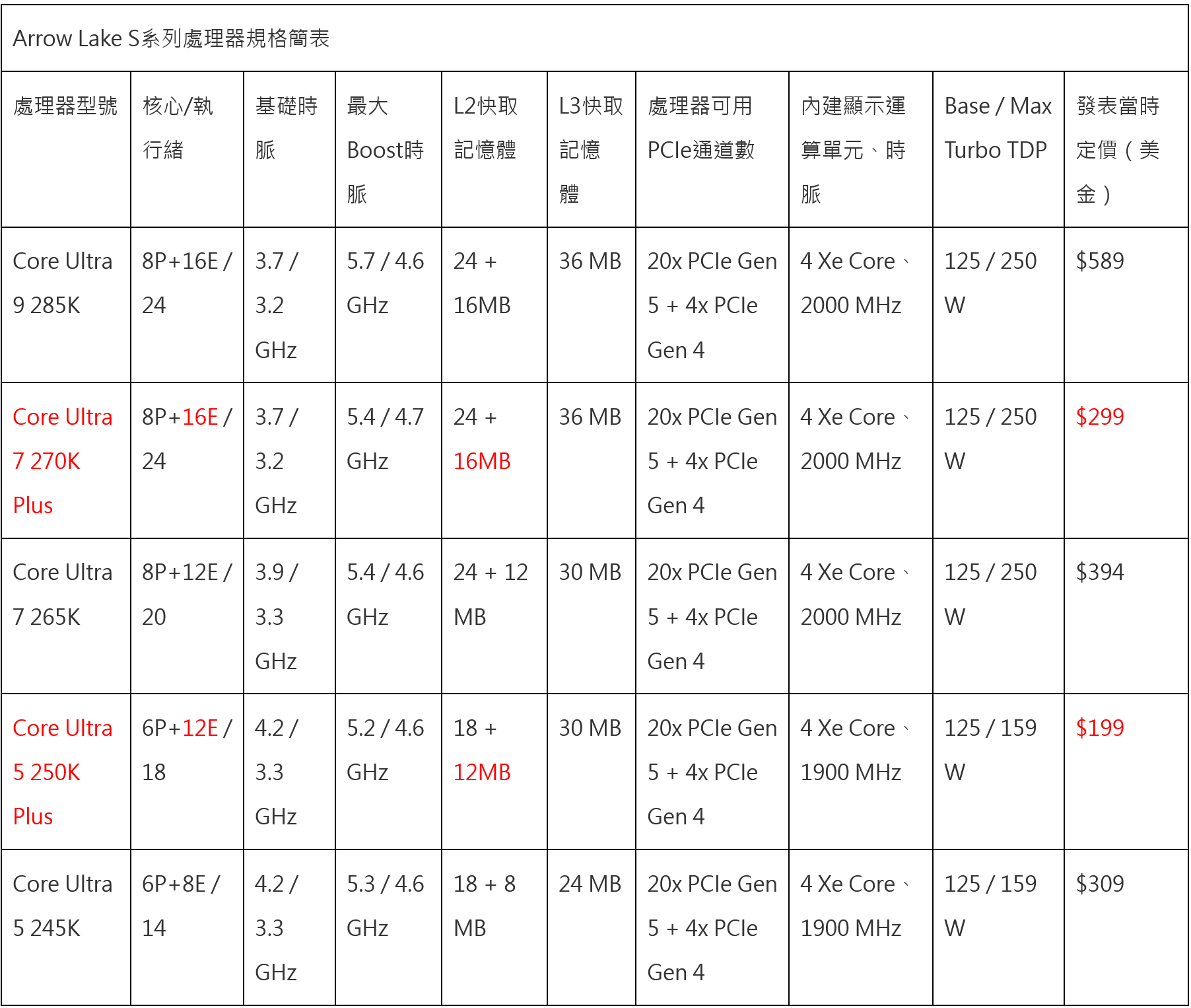 | Arrow Lake S系列處理器規格簡表 | |||||||||