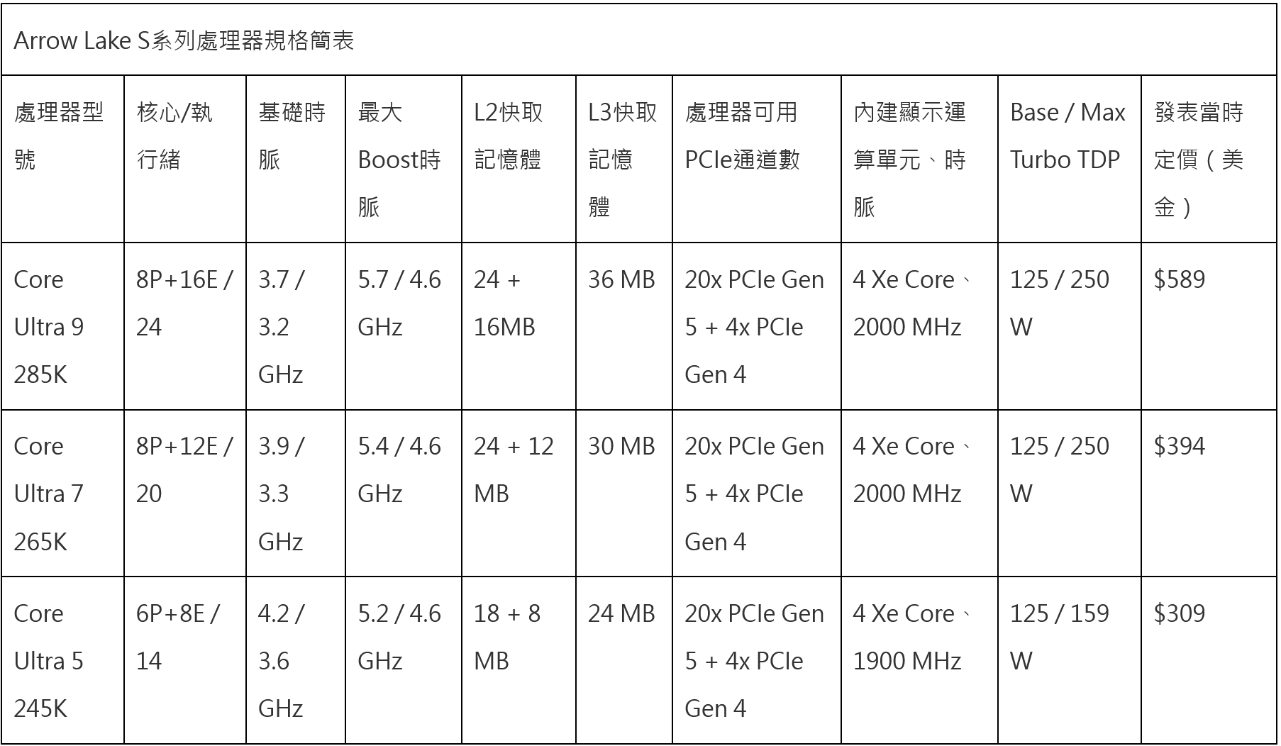 | Arrow Lake S系列處理器規格簡表 | |||||||||