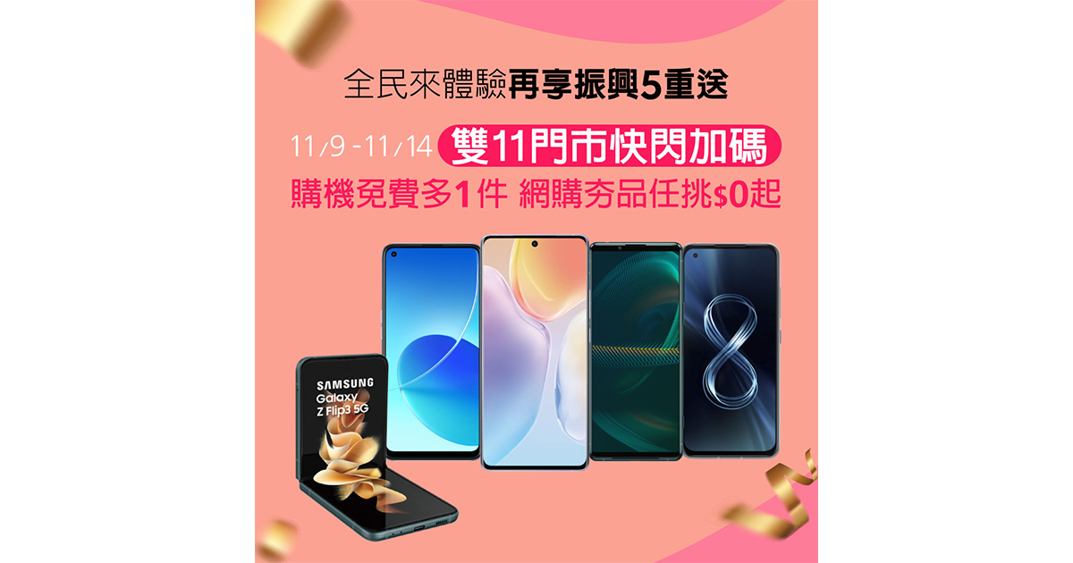 遠傳雙11祭出限時一週快閃優惠,11/9至11/14,凡於全台遠傳門市或網路門市申辦5G 999以上資費方案,搭配指定機款,即享雙11加碼送1,000元購物金,可至遠傳friDay購物雙11專區任選網購夯品,包含聲寶蒸煮料理鍋、手持直立式吸塵器、tokuyo Q頸枕等,只要0元就可免費帶回家。